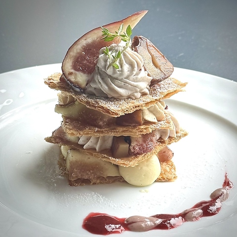 秋の味覚無花果と栗、サクッと薄く焼き上げたパイ生地の間には無花果シャンティ、キャラメルシャンティ、カスタードクリーム、ミルクムースなど層ごとに楽しんでいただけるミルフィーユです