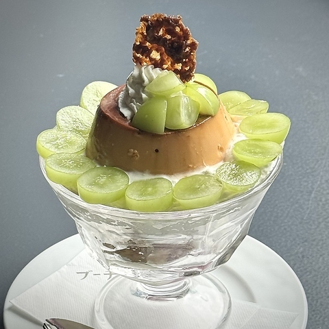 芳醇でさっぱりとした甘さのシャインマスカットとBOOCHiC自慢のプリン香ばしいヘーゼルナッツのチュイル、マスカルポーネシャンティ、ミルクムース、塩ミルクアイスなどパフェのようなプリンアラモードです