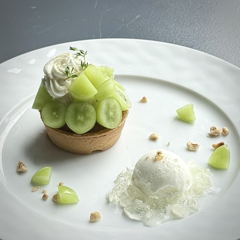 芳醇でさっぱりとした甘さのシャインマスカットを贅沢に使用しマスカルポーネシャンティ、ミルクムース、カスタードクリームで仕上げたタルトとマスカットジュレに塩ミルクアイスとの一皿です