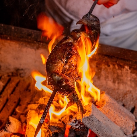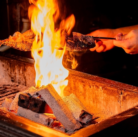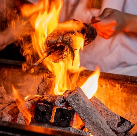 炉端焼きには、高知県の須崎備長炭を使用。食材を内部からじっくりと加熱していくので、魚はふっくらとした仕上がりになります。また、料理長が"強火の遠火"で焼き上げた食材は、香り高く食欲をそそる一品に。ひとくち食べると口のなかいっぱいに食材の持つ旨味が広がります。