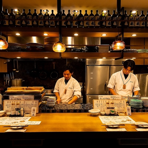 ド迫力!!臨場感あふれるカウンター!!目の前に旬の厳選素材が並んでいるのを見ながら、食べたいものを考えるのも一興。なんといっても豪快な炉端焼きが間近で堪能できるのもカウンター席ならではの特権です。