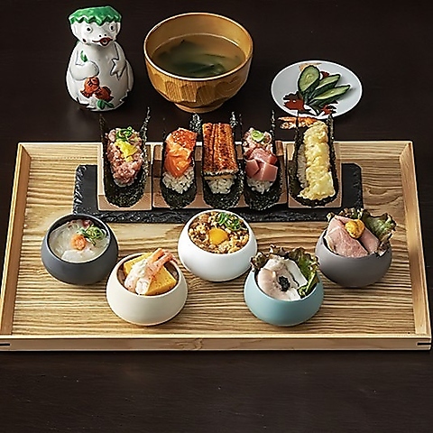 見て楽しい!食べておいしい!おちょこ丼と手巻き寿司のお得なセットです♪味噌汁・醤油・お漬物・わさび付き