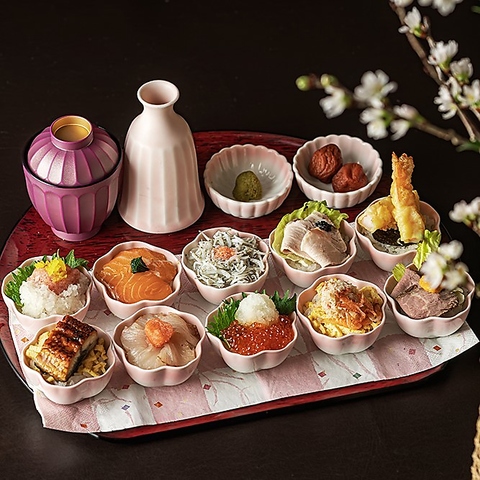 見て楽しい!食べておいしい!春限定のおちょこ丼お得なランチです♪みそ汁・漬物・わさび・茶漬け出汁付き