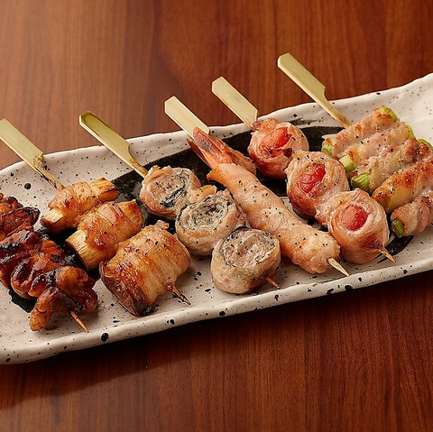 新鮮な野菜を1本1本丁寧に豚バラ肉で巻き上げた豚巻き串は絶品!1本からご注文頂けるので、好きなものを好きな分だけ食べれるのも串焼きの良いところ♪【忘新年会のご予約受付中◎2H飲み放題付き4500円(税込)~】