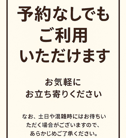 ご予約なしでもご来店出来ます。混雑時は、順番にご案内させて頂きます。宜しくお願い致します。