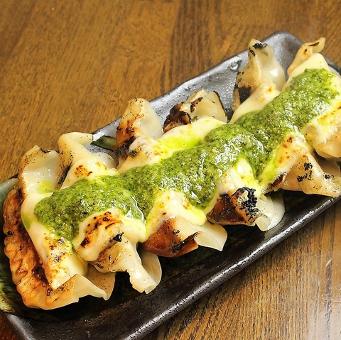 【餃子人気ランキング3】チーズのうえにたっぷりのバジルソース♪