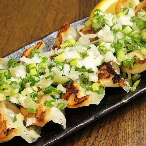 中身はジューシーで、野菜と肉のバランスが絶妙。焼き目パリッと、口に入れた瞬間に広がる旨味がたまらない!たっぷりのネギとレモンでさっぱり味わえる当店人気No.1の至極の一品です!