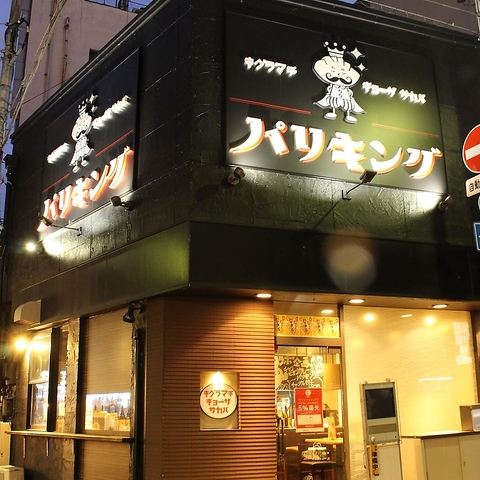 王冠を被ったマスコットが目印!「キグラマチ ギョーザ サカバ パリキング」の活気あふれる店構えです。深夜まで営業し、お一人様から仲間とまで気軽に立ち寄れる雰囲気が魅力。種類豊富な餃子と相性抜群のオリジナルドリンク「バリキング」で、賑やかな夜をお楽しみください!