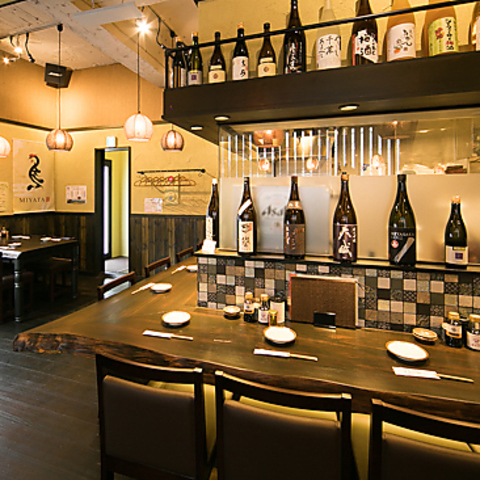 温かな灯りに包まれたカウンター席は、職人が備長炭で焼き上げる串の香りや音を間近で楽しめる特等席。ずらりと並ぶ日本酒や焼酎から好みの一杯を選び、料理と合わせてしっぽり過ごす大人のひと時に最適。仕事帰りの一杯や少人数での飲み会にも人気の、みや田ならではの臨場感あふれる空間です。