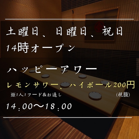 土日祝は14時~オープン!18時までのご注文でレモンサワー・ハイボール200円(税抜)にてご案内☆ゑ々とこ鶏自慢の逸品と心ゆくまでお楽しみください♪1人飲みも大歓迎です!!※おひとり様1フード&お通しのご注文をお願いいたします。