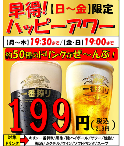 【月~木:19:30/金・日19:00まで】キリン一番搾り・ハイボール・サワー・焼酎など約50種⇒1杯199円(219円)