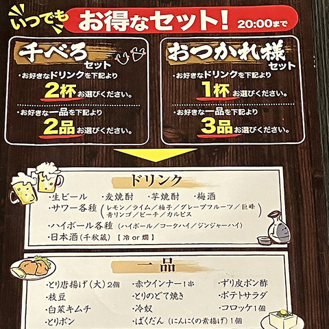 お好きなドリンク2杯・お好きな料理2品(詳細は店頭でご確認ください)※千ベロセットのみの場合、ポイント利用不可です。ご了承お願いいたします。