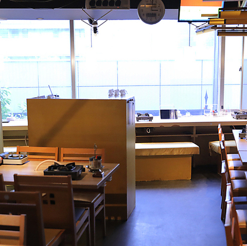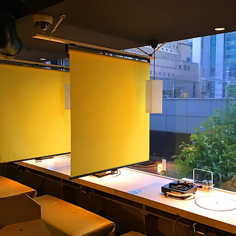 【仕切りがあるテーブル席】テーブルごとにロールスクリーンの仕切りがあって周りが気になりません。清潔感がありシックなインテリアで落ち着いた雰囲気です♪ご友人とのお集まりにも◎