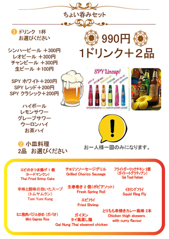 1ドリンク+小皿料理2皿で990円とお得なセットがございます☆ドリンクは生ビール+100円、ハイボール、レモンサワー、グレープサワー、ウーロンハイ、お茶ハイから選べます!小皿料理も本格タイ料理で大満足間違いなしなセットです!※お一人様一回のみです。