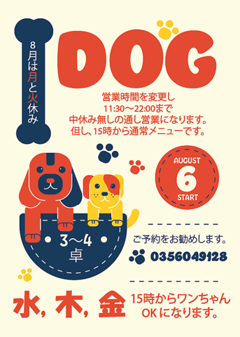 8月お試しで、水、木、金のディナータイム(15:00から)はワンちゃん店内okになります