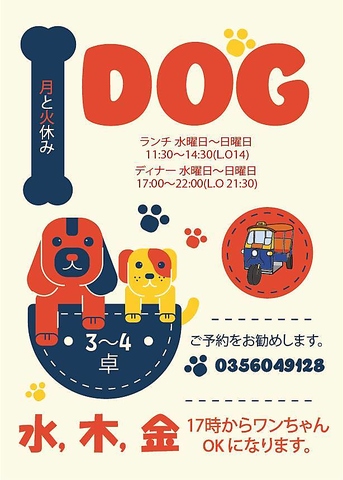 沢山のお客様のリクエストにお答えしまして、水、木、金のディナータイム(17:00から)はワンちゃん店内okになります