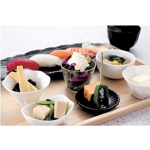 小鉢六景、寿司、味噌汁