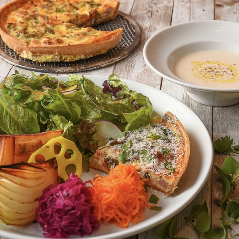 マザームーンカフェでのランチといえばこれ!季節ごとに旬な食材を使った豪華なプレートに仕上げました。