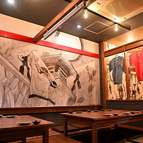 当店の掘りごたつお座敷席には、大きな神輿の絵が壁面いっぱいに飾られています。この迫力あるアートは、伝統的な日本文化を感じさせ、訪れる人々に特別な雰囲気を提供します。神輿の華やかさが空間を引き立て、和の心を大切にした居心地の良い空間を演出しています。大切なひとときを過ごすのにぴったりな場所です♪