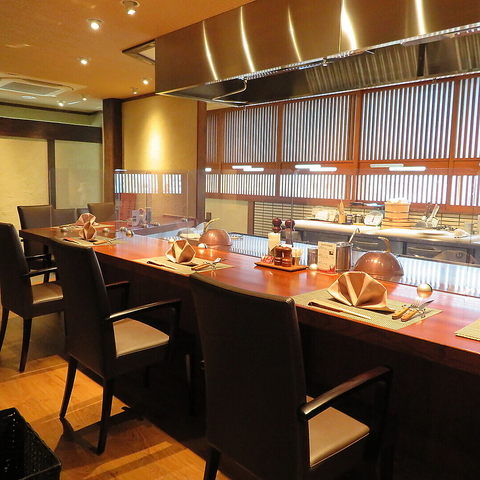 鉄板焼きのカウンター席は『華』席です。料理人の技を最前列アリーナ席でお愉しみください!