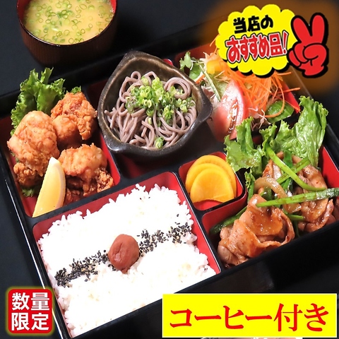 人気のおかず盛り沢山「日替わり松花堂弁当」(税込900円、コーヒー付き)などなど自慢の美味しいランチをどうぞ!