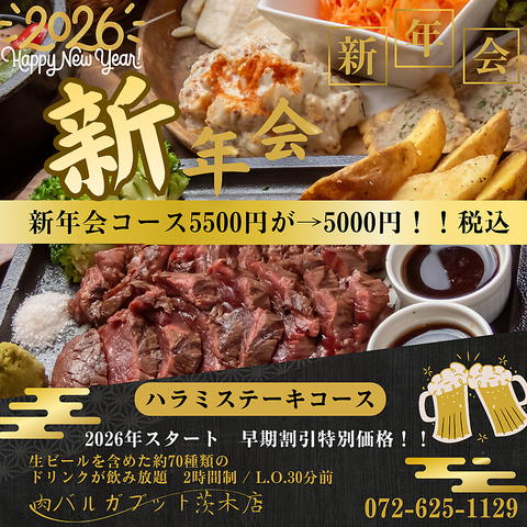 【新年会予約受付中】新しい一年の幕開けは美味しいお肉で景気づけ幹事様必見の予約限定特典【新年会 予約特典】人気のハラミステーキコース通常 5,500円→特別価格 5,000円ハラミステーキがメイン前菜からデザートまで全12品一年の始まりを美味しい肉とワインで乾杯しませんか?ご予約ご相談はお早めに