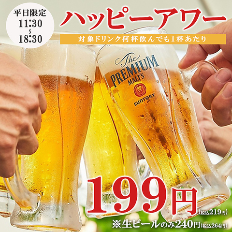 11:30~18:30の平日限定でハッピーアワー開催中!!対象ドリンク何杯飲んでも199円!!生ビール240円!!
