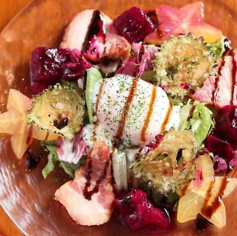 ドラゴンフルーツやスターフルーツに、旨みたっぷりのくんちゃまベーコン(豚トロ)をトッピング。さっぱり和風ドレッシングで仕上げた、沖縄の風を感じる彩り豊かなサラダです。