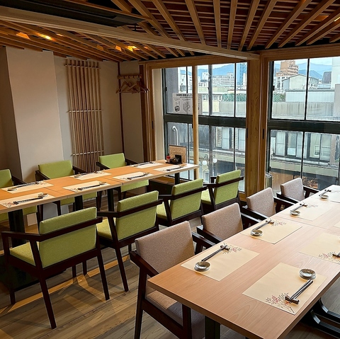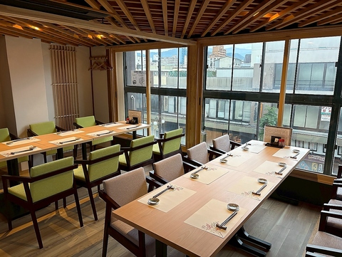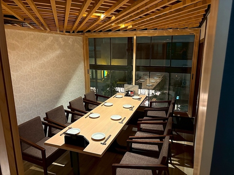 【最大20名様の完全個室】木の温もりを感じる開放的な空間は、大切な方との語らいやビジネスの接待、各種宴会にも最適です。大きな窓からは街並みが一望でき、四季折々の表情を楽しみながらお食事をご堪能いただけます。最大20名様まで収容可能な広々とした個室で、周りを気にせず上質なひとときをお過ごしください。