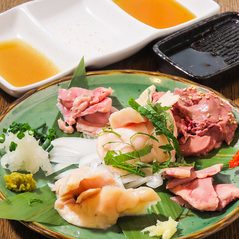 焼鳥心華の鳥刺し、お刺身は、鮮度に自信あり!特製のさしみ醤油で美味しくいただけます。お酒との相性も◯