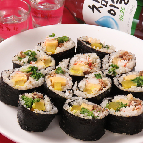 具がたっぷり詰まったおすすめキンパ◇テイクアウトでも大人気の逸品です。差し入れにも喜ばれる一品ですので是非お立ち寄りくださいませ。その他日替わりで珍しいキムチなどもございます♪