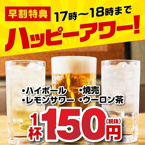 早い時間がおすすめ♪ 17時-18時の間は、焼売・ハイボール・レモンサワー・ウーロン茶が全て150円!!