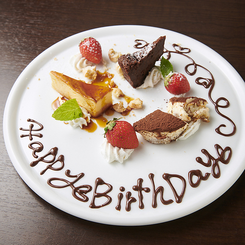 誕生日・記念日のお客様向けに特製ケーキをシェフの手作りでご用意させて頂いております!事前予約制にはなりますが、女子会・記念日・お誕生日のお祝いにメッセージつきプレートでご用意できます!