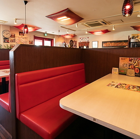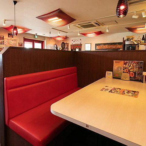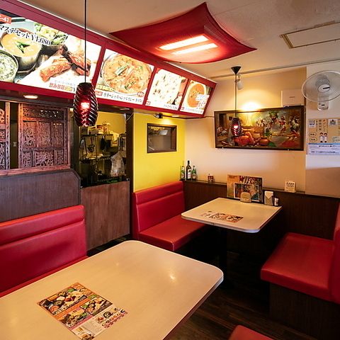 赤が印象的なアジアンテイストな空間で、本格インドカレーを楽しめます!4名様用のテーブル席を3卓ご用意しております。ご友人同士やご家族での普段のお食事など、幅広いシーンでご利用ください。