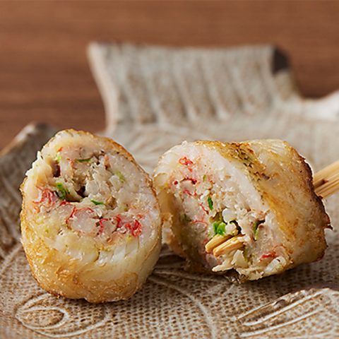 串揚げの概念にとらわれず、あえて衣を付けない一品。ズワイガニの身をほぐして、しいたけ・柚子・玉子などを合わせて、キスで巻いております。アルミホイルに包んで揚げることで蒸された状態になり、キスもふっくらとやわらかく贅沢な味わいです。