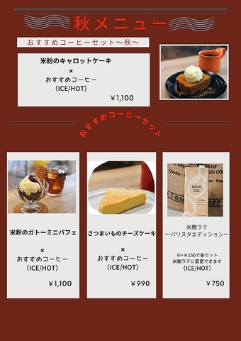 季節ごとの米粉スイーツとおすすめのコーヒーがセットで選べます。限定セットのため数に限りがございます。