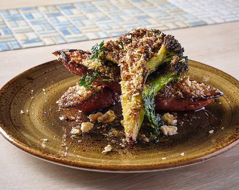 三浦野菜のスパイスステーキ。他にもトマトベースのビーガンカレーや、シェフこだわりのビーガンバーガーも!