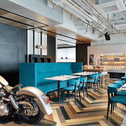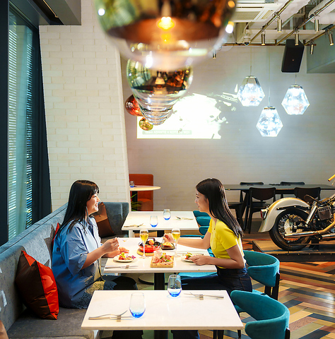《アメリカの倉庫をイメージした、アートにこだわりのある洗練空間》入口近くのハーレーダビッドソンのバイクや、特徴的なTomDixonの照明器具、みゆき通りに面した開放的な吹き抜けや、大きな窓、そしてダイニングには二つの象徴的なアート作品が並ぶ、お洒落でカジュアル空間が広がります。