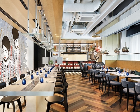 《アメリカの倉庫をイメージした、アートにこだわりのある洗練空間》入口近くのハーレーダビッドソンのバイクや、特徴的なTomDixonの照明器具、みゆき通りに面した開放的な吹き抜けや、大きな窓、そしてダイニングには二つの象徴的なアート作品が並ぶ、お洒落でカジュアル空間が広がります。