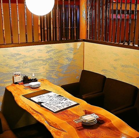 落ち着きある店内は、疲れを癒す空間造りでおもてなし致します。落ち着いた空間でお勤め先での接待、宴会はもちろん、デートなどのプライベートでもご利用いただけます。