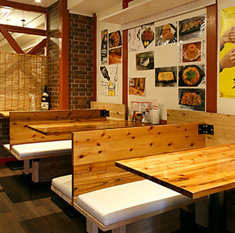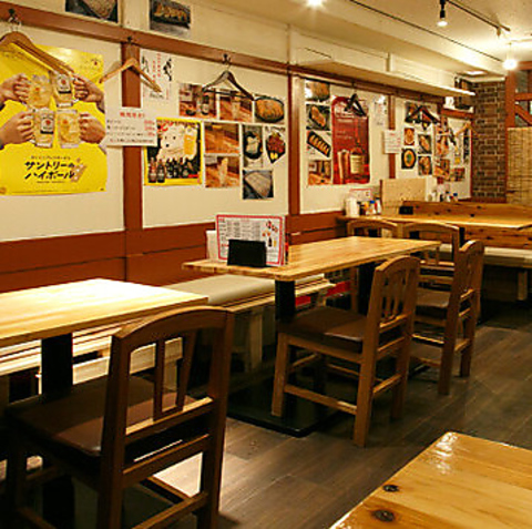 明るい木目のテーブルと椅子で統一された、清潔感あふれるテーブル席!お一人様から少人数でのご利用にぴったりです。活気ある店内で、美味しい料理とお酒をお楽しみください♪