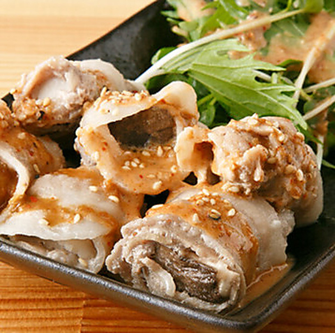 ジューシーな豚肉で香り高いエリンギを巻き上げた一品です。焼き加減が絶妙で、肉の旨味とエリンギの食感が楽しめます。特製のタレが絡まり、香ばしさが引き立つ、クセになる味わいです。お野菜とともにどうぞ。