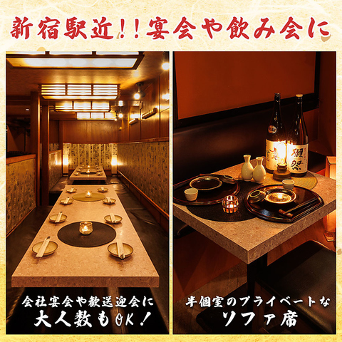 鮮度抜群の刺身の盛り合わせや宴会にぴったりな逸品を各種ご用意しております。新宿エリア、新宿西口エリアでの飲み会や宴会、歓迎会や送別会など各種宴会に◎お得なクーポンもご用意しておりますのでご予約前にクーポンページも要チェック♪広々とした個室席も多数ご用意しております!