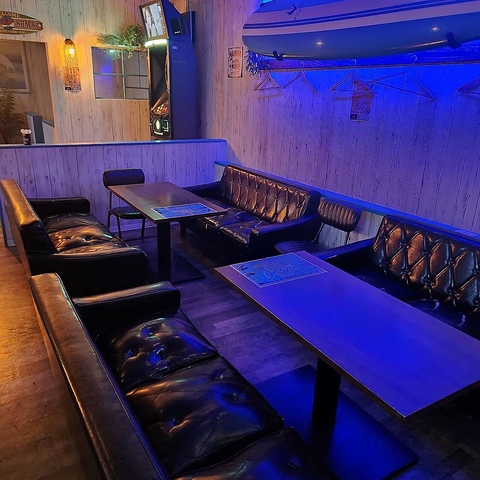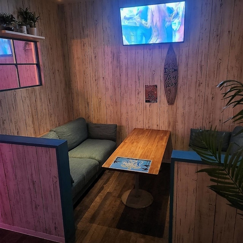 【BOX席】ハワイをイメージしたリゾート感覚溢れる店内。入口近くにはバーカウンターもございます。少人数でのご利用やデートは勿論、1名様でお越しの場合でもゆったりとお寛ぎ頂けます。