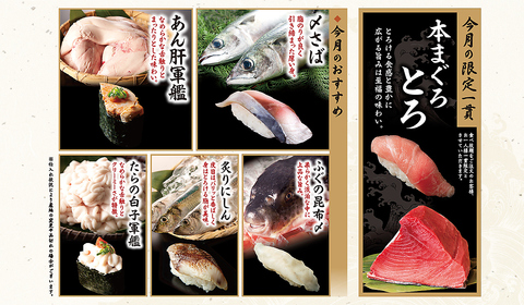 月替わりの旬なネタも食べ放題♪今月は【〆さば・あん肝軍艦・ふぐの昆布〆・炙りにしん・たらの白子軍艦】