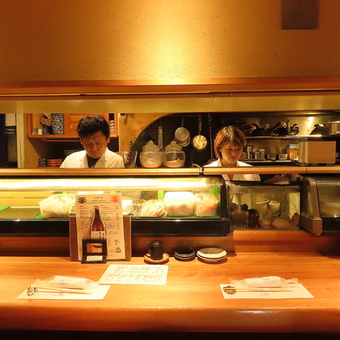 お一人様からお気軽にご利用いただけるカウンター席。ショーケースに並ぶ旬の食材を眺めながら、大将との会話や職人の技を間近で楽しめる特等席です。