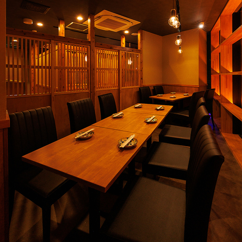 団体様のご利用にも最適です。洗練された空間は、優しく灯る間接照明が印象的な個室席です。個室席のご予約はお早めに!人数に合わせたお席をご提案させていただきます。
