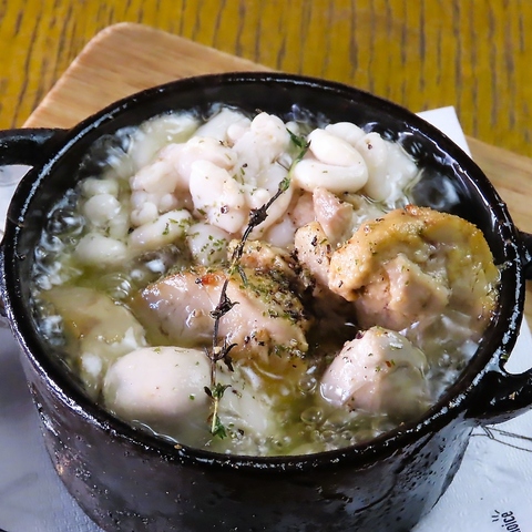 白子・牡蠣・魚介など、旨みたっぷりの海の幸を熱々のガーリックオイルで。濃厚な味わいにワインが止まらない一品です。パンにオイルを浸して最後まで美味しくどうぞ♪