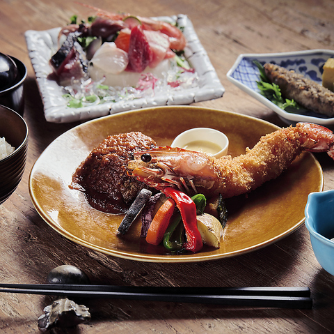 近江牛ハンバーグランチ(マルレ特製デミグラスソース)・大きな海老フライ1尾・本日の一品・本日の鮮魚・お惣菜・ごはん・汁物