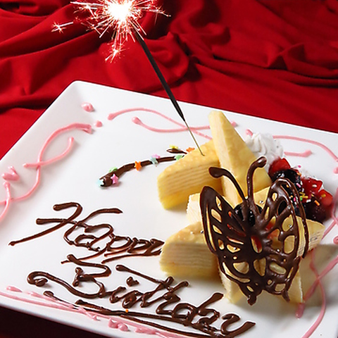 記念日のお祝いや宴会のサプライズにメッセージ付デザートプレートを贈りませんか。ご予約の際に希望のメッセージ内容を要望欄にご記載ください。利用条件:2名様~ / コース利用限定 / 要予約